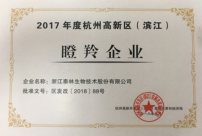 泰林生物連續(xù)3年獲評(píng)高新區(qū)(濱江)瞪羚企業(yè)稱號(hào)