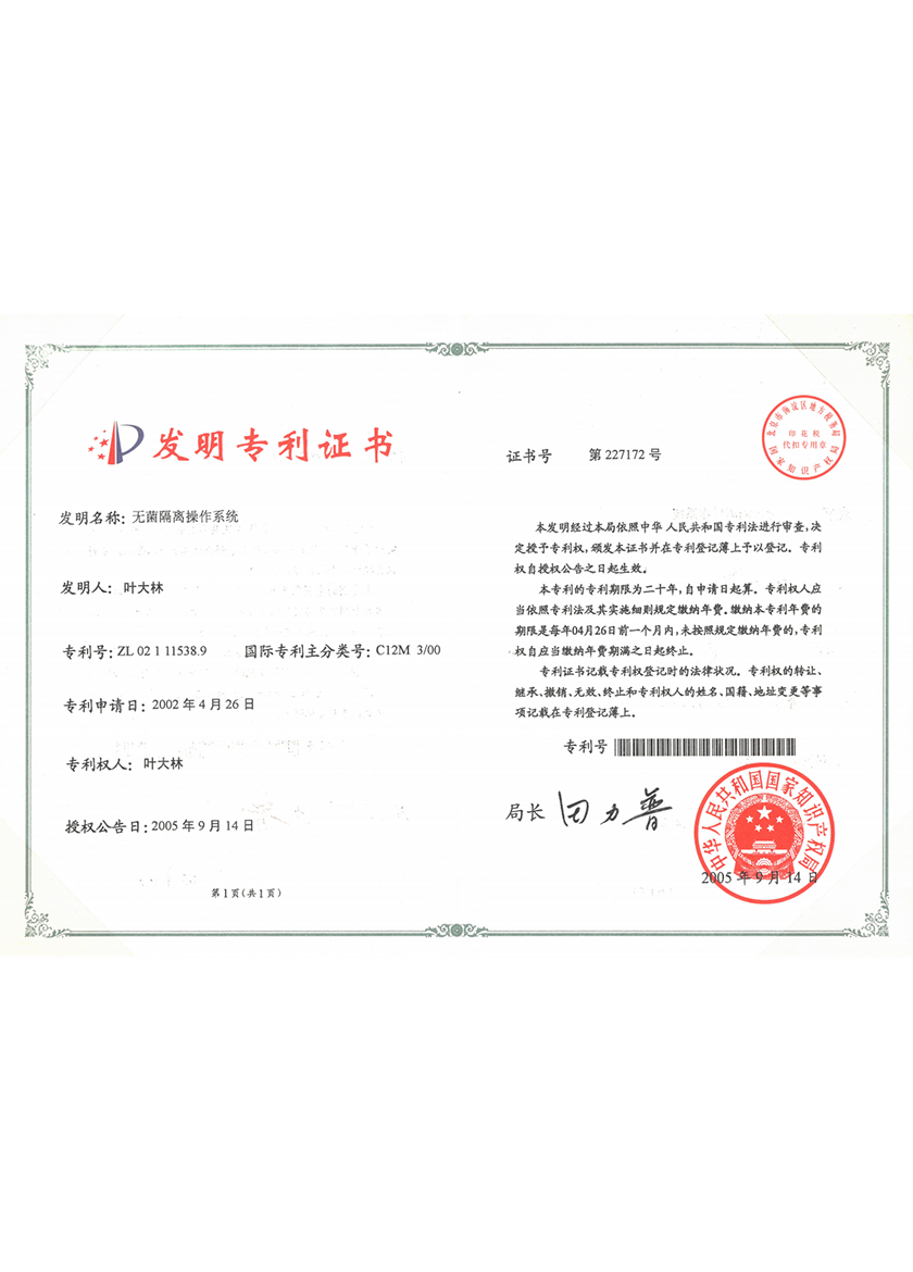 無菌隔離操作系統(tǒng)ZL02111538. 9 -